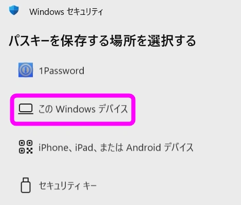 じゃあ、楽天証券のパスキーの「秘密鍵」の保存先を「このWindowsデバイス」を選択すると・・・・