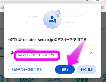 ここで「続行」をクリックすると、楽天証券のパスキーが「1Password」に保存されます。