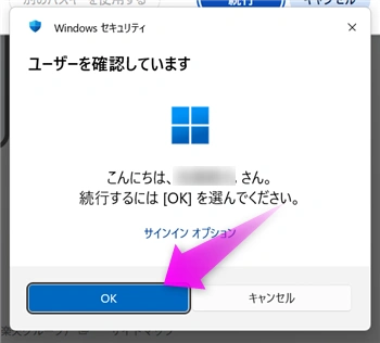Windows Helloが行われ、認証が済むと「OK」が表示されます。