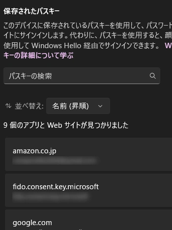 すると、このようにWindowsデバイスに保存したパスキーの一覧が表示されました。