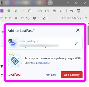 Lastpassにも実はパスキーを保存する機能があって、パスキーを保存したり使う場面になると、拡張機能が検知して独自のLastpassパスキーのポップアップが表示されます。