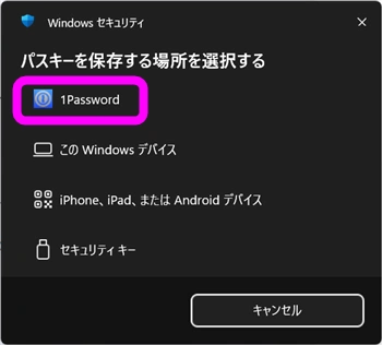 ここで「1Password」というアプリが表示されていますが、このように以前使っていた1Passwordに保存したパスキーを削除していなかったので、候補に出てきてしまっています。