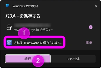 このようにパスキーの保存先が、「1Password」になるはずです。