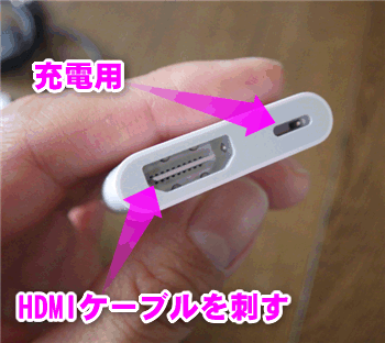 このアダプターにはHDMIケーブルを刺す穴と、充電用のLightningケーブル用の穴があります。