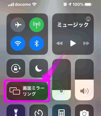 iPhoneのコントロールパネルを表示させたら、「画面ミラーリング」をタップします。