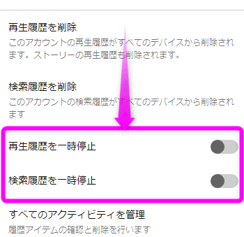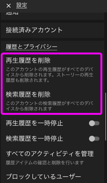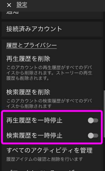 いちいち削除するのがめんどくさい、という人はそもそも検索履歴・再生履歴を保存させないことも出来ます。まずは上の設定で保存された再生・検索履歴を削除してから先ほどの「設定」の画面に戻り、「再生履歴を一時停止」「検索履歴を一時停止」をそれぞれタップします。