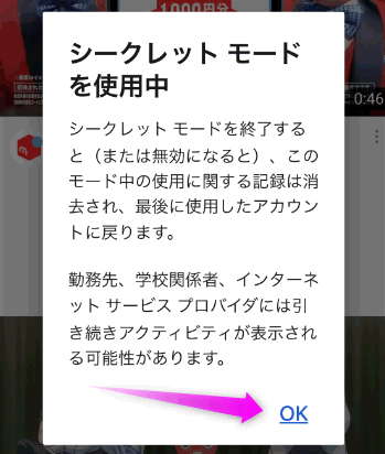 シークレットモード中は一切の履歴が保存されないという説明が表示されます。ただし、「戻る」などで見ていた動画がばれることがあるので、最終的に「シークレットモード」を終了してください。終了するときに閲覧データが駆除されます。という警告が表示されるので、「OK」をタップします。