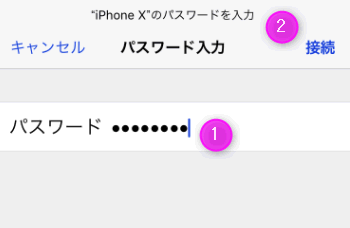 接続先に表示されていた「Wi-Fiのパスワード」を①に入力し、②の「接続」をタップします。