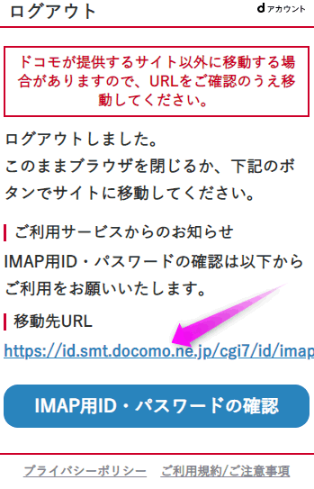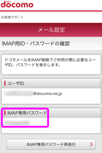IMAPパスワードは、My docomoの「メール設定」にある「IPAP用ID・パスワードの確認」から調べることが出来ます。