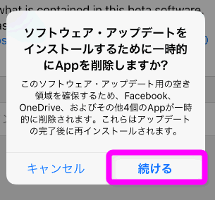 16GB版のiPhoneなど、内蔵メモリの容量が足りない場合は、このような警告が表示されますが「続ける」をタップします。