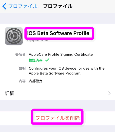 設定 → 一般 → プロファイル と開いていき、「iOS Beta Software Profile」をタップ。