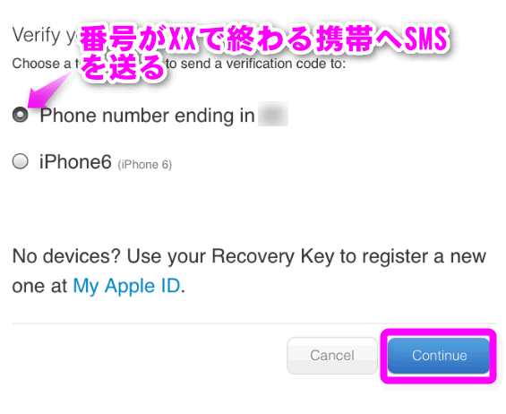 二段階認証を設定している場合は、認証メールを送る端末をチェックして、「Continue」をタップします。