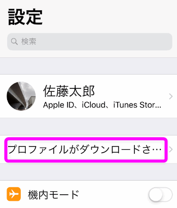 設定を開くと、「プロファイルがダウンロードさ...」のような表示があるのでここをタップします。