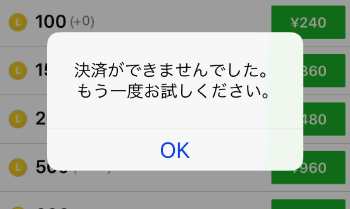 このとき「OK」をタップすると、「決済ができませんでした。もう一度お試しください」と表示され、ここでもOKをタップしないと先に進めません。
