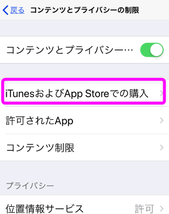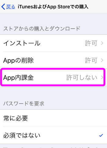 ここが「許可しない」になっていると、有料アプリなどの購入や、アプリ内での購入(LINEの有料スタンプなど)が出来なくなります。