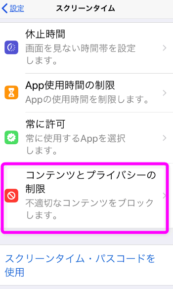 「コンテンツとプライバシーの制限」というなんだか難しそうな項目があるので、ここをタップします。