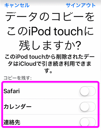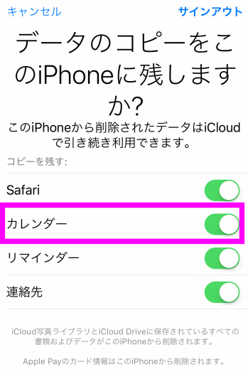 なんとなくデータが消えてしまいそうで怖い!と思われるかもしれませんが、この「Safari」「カレンダー」「連絡先」「リマインダー」などのデータは、全てインターネット上のiCloudという場所に自動でバックアップされているので、コピーを残しておかなくても次にサインインした時に自動的に復活するので大丈夫です。
