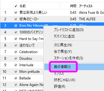 ローマ字になってしまった曲の曲名を右クリックし、「曲の情報」を選択します。