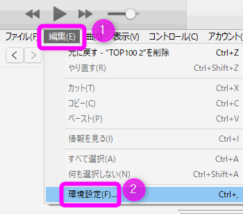 iTunesの①「編集」を開き、②「環境設定」を選択します。