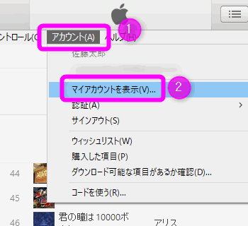 iTunesのメニューから①「アカウント」を開き、②「マイアカウントを表示」を選択します。