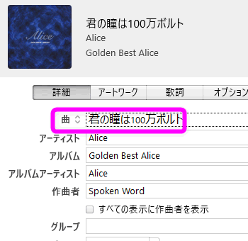 「詳細」タブの「曲」の部分を日本語に書き換えます。