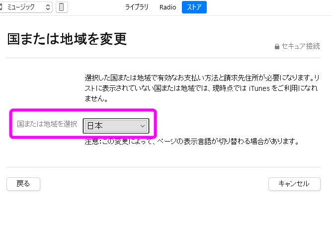 「国/地域」が日本以外になっている場合は、「国または地域を変更」をクリックします。