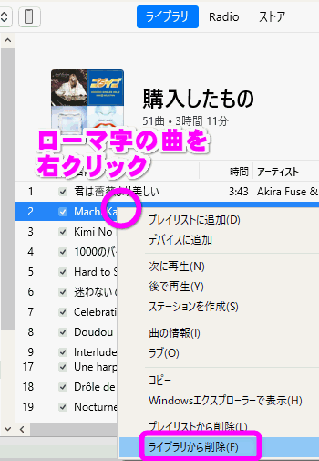 まずはローマ字になってしまったiTunes上の曲を右クリックして「ライブラリから削除」を選択します。