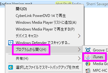 変換されたMP3ファイルを右クリックし、「プログラムから開く」で「iTunes」を選択し、iTunesに曲を追加してやると、無事正式な曲の長さで再生させることが出来ました。