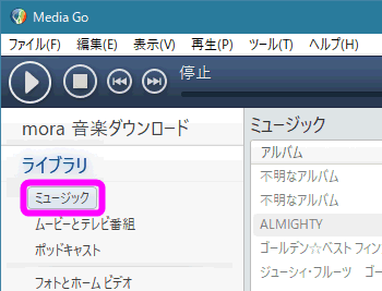 Media Goに曲を追加させたら、左側の「ミュージック」をクリックします。