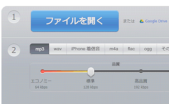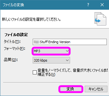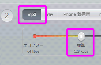 まずは②の変換後のファイルが「mp3」になっていて、ビットレートが「標準」になっていることを確認します。