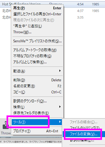 この曲を右クリックし、「ツール」の中にある「ファイルの変換」をクリックします。