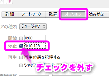 ここにチェックが入っていると指定した時間で再生がストップ(もしくは次の曲へ)してしまいます。