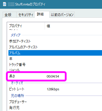 たとえばこの曲は、Windowsのエクスプローラーから「プロパティ」で確認すると、4分54秒になっています。
