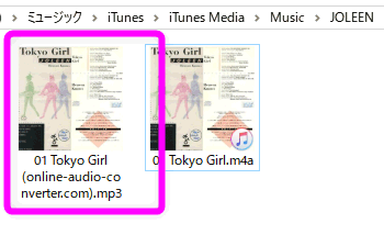 なお、変換されたファイルには「online-audio-converter.com」というファイル名が追加されますが、iTunes側のタイトルは曲名のままなので安心してください。