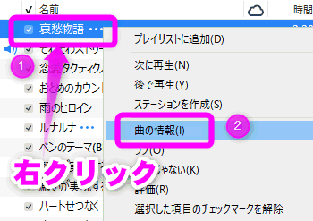 iTunesを立ち上げ、途中で停止してしまう曲を右クリックし、表示されたメニューから「曲の情報」を選択します。