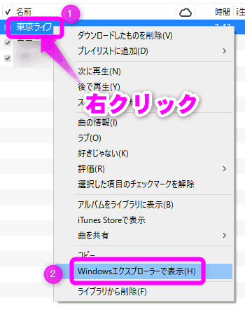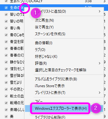 続いて、iTunesで途中で停止してしまう曲名を右クリックし、②「Windowsエクスプローラーで表示」を選択します。