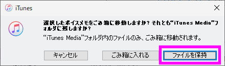 この時このようなゴミ箱に移動するか聞かれた場合は、「ファイルを保持」をクリックしてください。