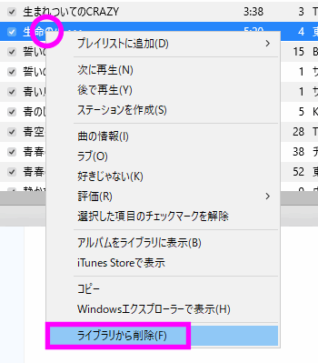 続いて曲が途中までしか再生されない曲をiTunes上で右クリックし、「ライブラリから削除」を選択します。