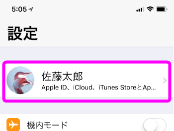 設定を開き一番上の名前の部分をタップします。