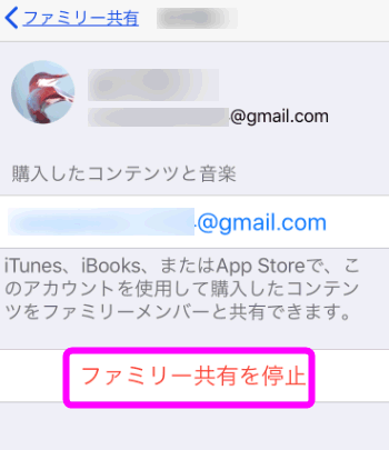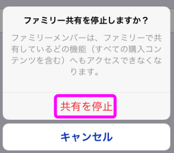 ファミリー共有を停止していいか聞いてくるので、「共有を停止」をタップします。