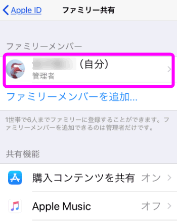 もし、「ファミリー共有」がオンになっているとこの様に管理者の部分に(自分)と表示されています。