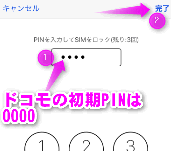 設定してあるSIM PINコードを入力します。ドコモの場合、初期設定は「0000(数字の0を4つ)」です。