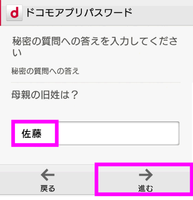 すでにドコモアプリパスワードを変更したことがある場合、「設定」→「ドコモのサービス/クラウド」→「ドコモアプリパスワード」を開くと、このように設定した秘密の質問が表示されるので、「答え」を入力し、「進む」をタップします。