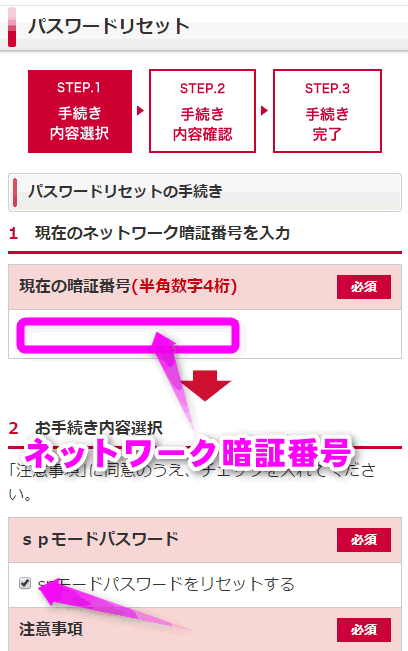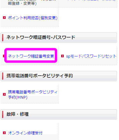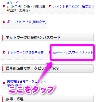 すると「ネットワーク暗証番号・パスワード」のところに「spモードパスワードリセット」というリンクがあるので、ここをタップします。