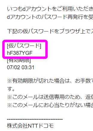 docomoのメールアドレス(もしくはIDとして登録したメールアドレス)に、「仮パスワード」が記載されて届きます。