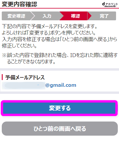 入力したメールアドレスが表示されるので、間違いがないか確認し、「変更する」をタップします。