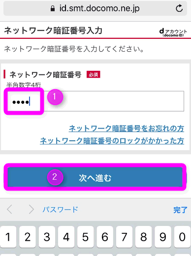 ①ネットワーク暗証番号を入力し、②「次へ進む」をタップします。