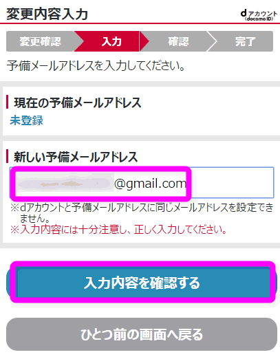 dアカウントで使用しているメールアドレス意外のメールアドレスを入力し、「入力内容を確認する」をタップします。