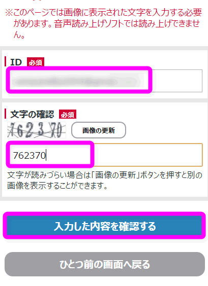 dアカウントのID(メールアドレス)を入力し、表示されている画像の数字を入力します。