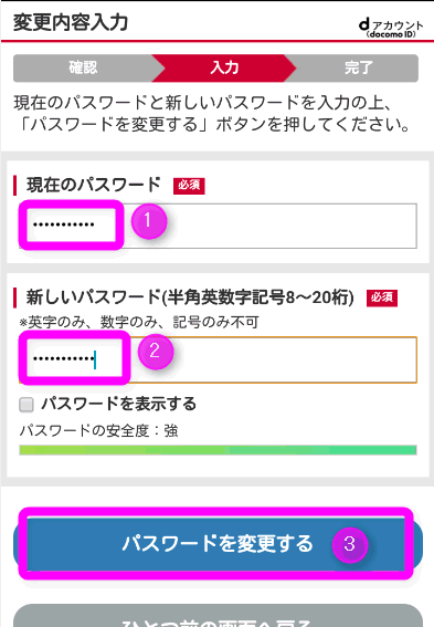 ①に古い現在のパスワードを入力し、②に新しいパスワードを入力します。